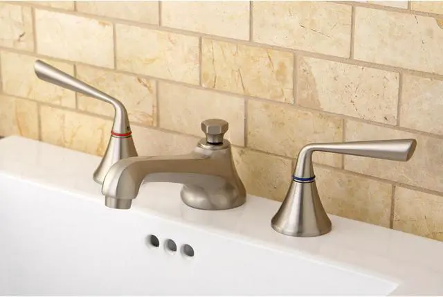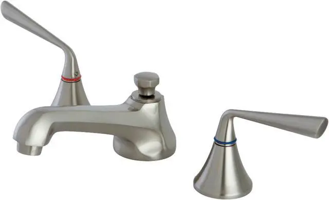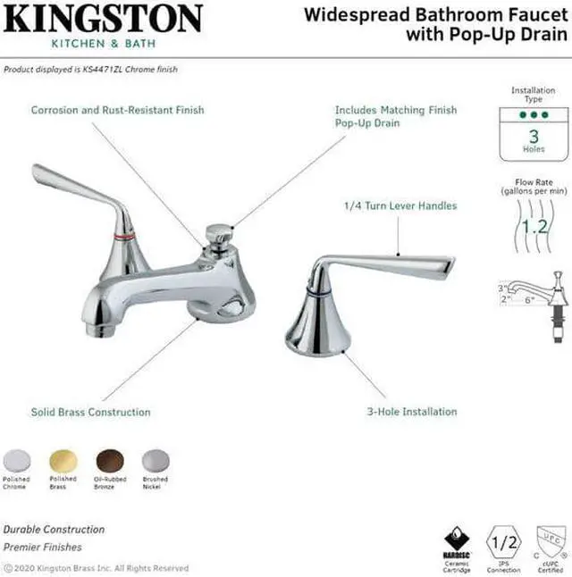 This faucet's modern features create a bold and edgy design in your bathroom. Ideal for more spacious bathrooms, widespread faucets are more spread apart and feature a 3-hole installation. The Kingston Brass 8-Inch Widespread Bathroom Faucet with Brass Pop-Up and its featured sturdy brass construction and premium brushed nickel finish are glamorize your home's modern ensemble for years to come. A matching finish drain is also included.
