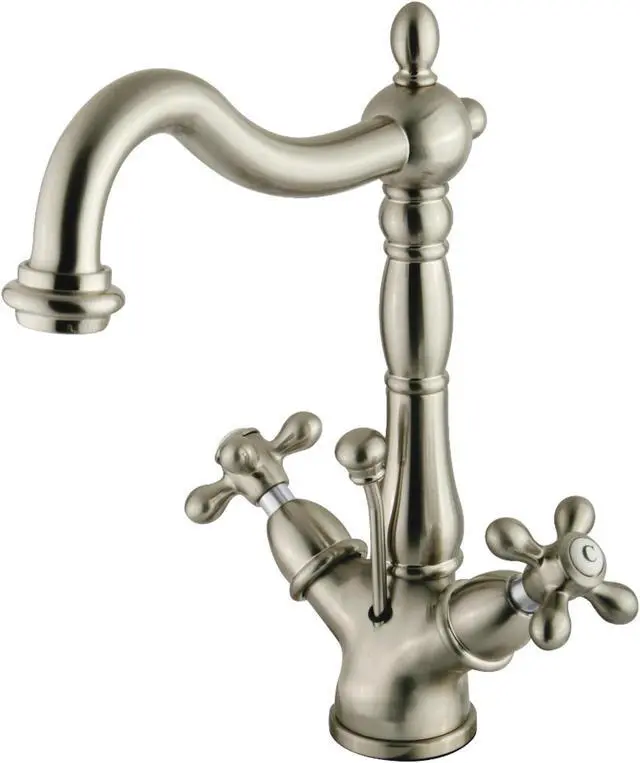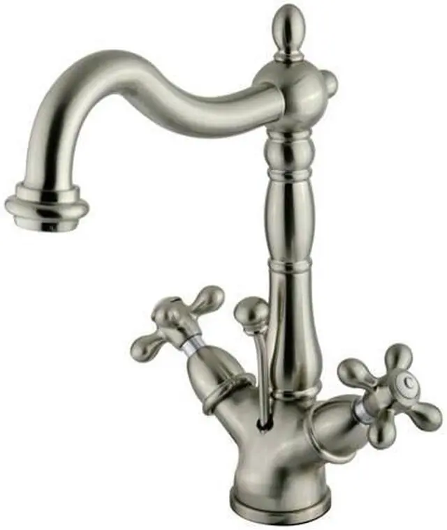 A lavish spark of traditionally stylized glamour is brought to your bathroom ensemble with this beautiful faucet. Centerset bathroom faucets are ideal for smaller bathrooms and feature an easy 1 or 3-hole installation. Remove the deck plate for an ease of cleaning and more streamlined design. The Heritage 4-Inch Centerset Bathroom Faucet and its featured sturdy brass construction and premium brushed nickel finish are glamorize your home's traditional ensemble for years to come. Celebrate sophistication and traditional decor with this statement piece. A matching finish drain is also included.