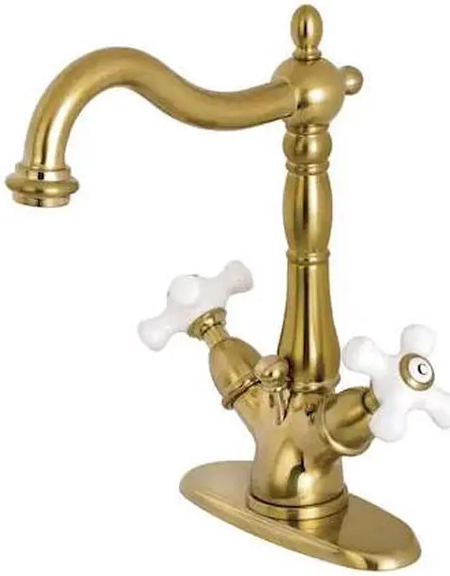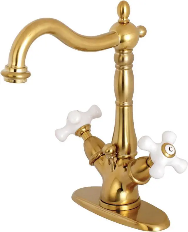 A lavish spark of traditionally stylized glamour is brought to your bathroom ensemble with this beautiful faucet. Centerset bathroom faucets are ideal for smaller bathrooms and feature an easy 1 or 3-hole installation. Remove the deck plate for an ease of cleaning and more streamlined design. The Heritage 4-Inch Centerset Bathroom Faucet and its featured sturdy brass construction and premium brushed brass finish are glamorize your home's traditional ensemble for years to come. Celebrate sophistication and traditional decor with this statement piece. A matching finish drain is also included.