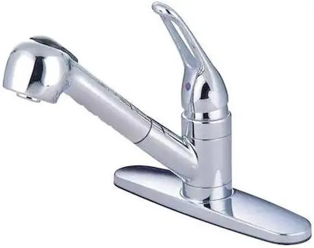 The exquisite design of this faucet tastefully flatters the elegant architecture of traditional homes with its fine detailing. An excellent options for smaller kitchens, the angled spout and extendable hose reach provide an optimized use of space. Minimalist design along with a classic style help you tackle your tough messes with the Kingston Brass Single-Handle Pull-Out Kitchen Faucet's two-function sprayer. The brass construction and single handle also provide a sturdy, reliant, and easy to use fixture.
