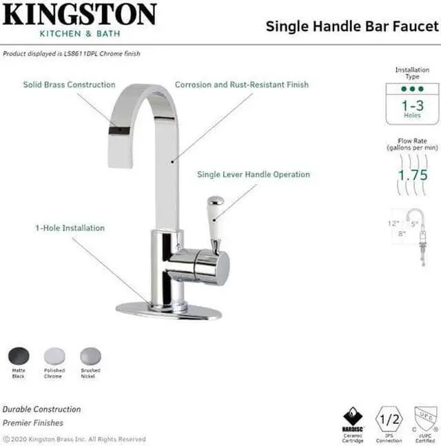 Solid brass construction1.75 GPM/6.62 LPM spout flow rate at 60 PSIDrip-free ceramic disc cartridgeJ-spout has 4-15/16" reach with a 11-11/16" height7-13/16" clearanceThis product can expose you to chemicals which is [are] known to the State of California to cause cancer or birth defects or other reproductive harm.For more information go to www.P65Warnings.ca.gov.