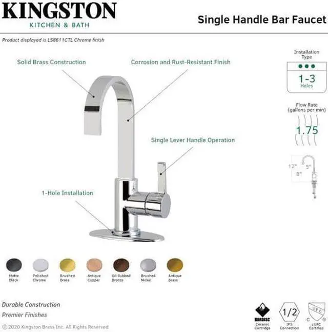 Solid brass construction1.75 GPM/6.62 LPM spout flow rate at 60 PSIDrip-free ceramic disc cartridgeJ-spout has 4-15/16" reach with a 11-11/16" height7-13/16" clearanceThis product can expose you to chemicals which is [are] known to the State of California to cause cancer or birth defects or other reproductive harm.For more information go to www.P65Warnings.ca.gov.
