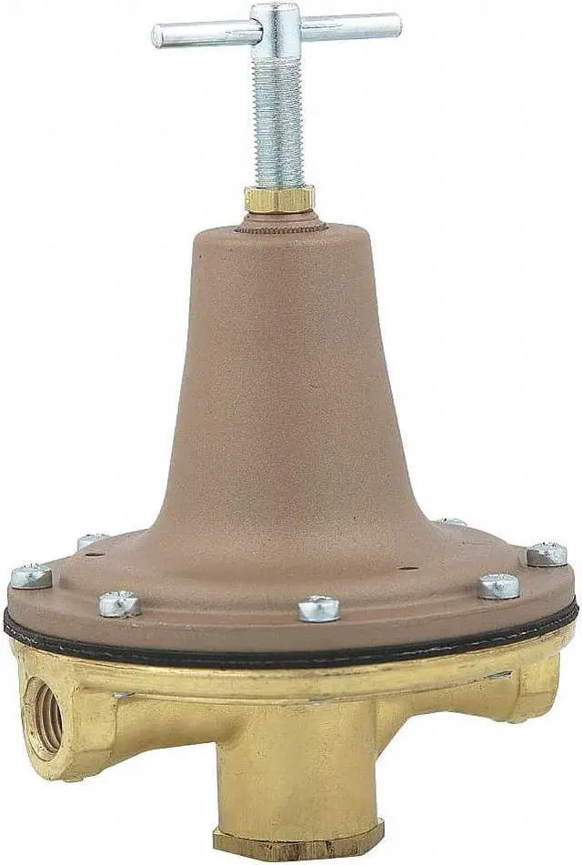 Pressure Regulator, Series 215, Body Material Brass, Inlet Size 3/8 in, Outlet Size 3/8 in, Length 4 1/4 in, Height 6 in, Application Commercial Use, Residential Use, Connection Type FNPT, Pressure Adjustment Range 0 to 50 psi, Gauge Port Size Not Applicable, Seal Material Buna-N, Max. Temp. 120 Degrees F, Pipe Size 3/8 in, Max. Pressure 300 psi, Compliance Lead Free. This item has been restricted from sale in the following state (s): []