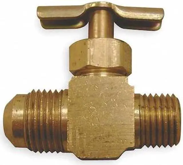 Needle Valve, Straight, Body Material Brass, Pipe Size 1/8 in x 1/4 in, MNPT x Tube Connection, Stem Type Brass, Seal Material Metal, Handle Material Steel, Max. Pressure 150 psi, Temp. Rating 0 Degrees to 250 Degrees F, Max. Height 1 1/32 in, Length 1 5/16 in