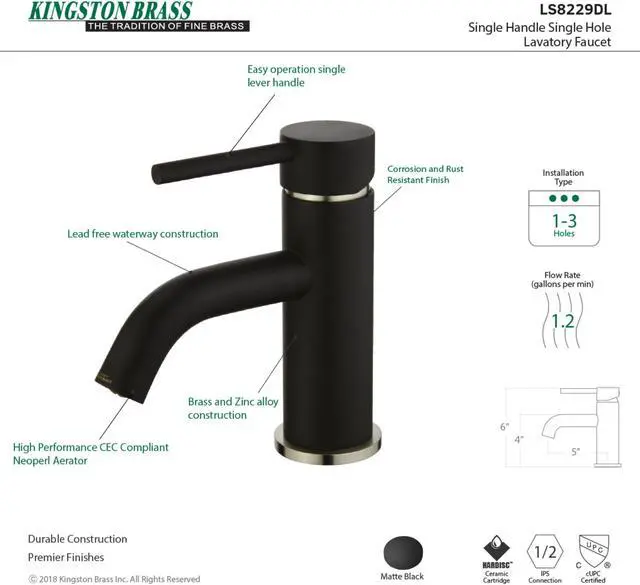 This faucet boasts bold, sleek design with its cylindrical styling. Single-hole bathroom faucets provide a more streamlined look. Also, they will allow your bathroom to appear more spacious with the limited counter space they require. The Concord single-handle bathroom faucet and its featured sturdy brass construction and premium matte black/brushed nickel finish are glamorize your home's modern ensemble for years to come. Flash the radical brilliance of contemporary trends with this statement piece. A matching finish drain is also included.