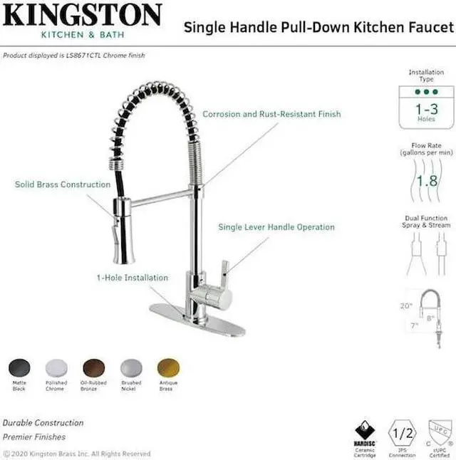 Transcend your home into a futuristic utopia with this faucet's brilliant craftsmanship and modern, curved spout with ergonomic levers. Designed for optimum versatility and functionality, modern day technology is provided for a state-of-the-art product. The Continental Pull-Down Kitchen Faucet features a high arching spout to easily clean larger dishes, swivel ability to reach any area in and around your sink, and a dual function pull-down sprayer to tackle tough messes.
