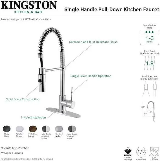 Sleek luxury is offered at its finest with this faucet's particular styling. Designed for optimum versatility and functionality, modern day technology is provided for a state-of-the-art product. The New York Single-Handle Pull-Down Kitchen Faucet features a high arching spout to easily clean larger dishes, swivel ability to reach any area in and around your sink, and a dual function pull-down sprayer to tackle tough messes.