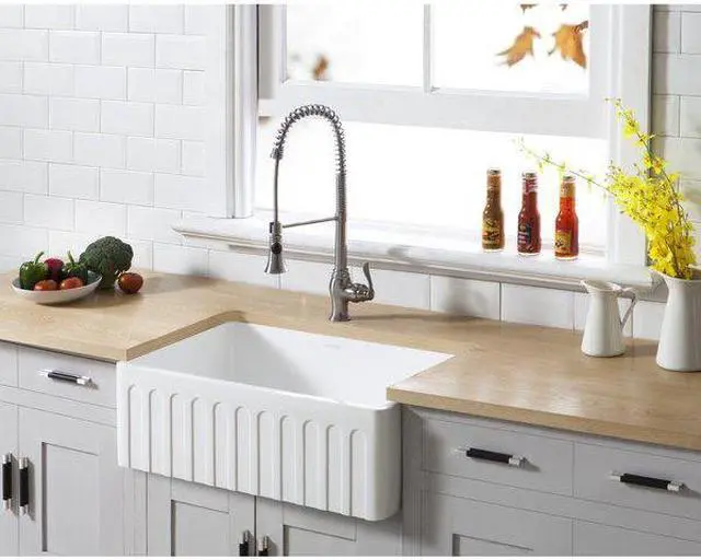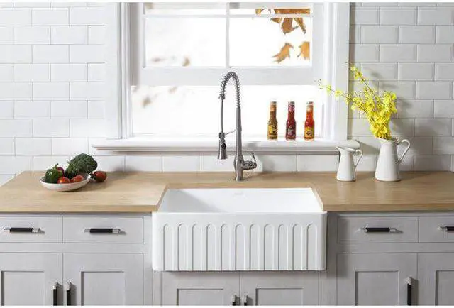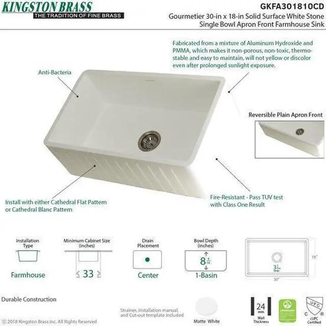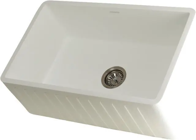 Coordinated with an elegant pairing of quality construction interwoven with sophisticated designs and styles, the Arcticstone Collection is crafted to bring aesthetic beauty alongside exceptional performance with its line of farmhouse kitchen sinks. Farmhouse sinks have an apron front that causes the sink to be the centerpiece of kitchen design. This unique feature prevents water spillage on cabinetry while adding aesthetic appeal. Constructed from a high quality mixture of stone and acrylic polymers, a non-porous, stain-resistant surface is generated, as the thick material provides long-lasting durability and reliability. Also provided is the single bowl which lends an ease in washing larger dishes. For a generous washing area, the Arcticstone sink has overall dimensions of 30 inch (L) x 18 inch (W) x 9-9/16 inch (D). Allow this farmhouse sinks to impeccably complete your contemporarily styled kitchen.