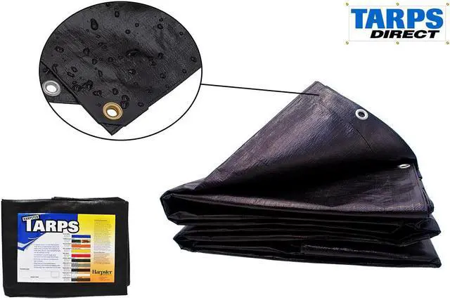 Harpster Tarps Heavy Duty Black Poly Tarps by Tarps Direct are waterproof, tear and acid resistant. The fabric weighs 6 ounces per square foot and is 11-12 mil thick with a 14x14 weave count. Grommets are spaced approximately every 18 inches and in the reinforced corners, for plenty of tie down options. The black color blocks out 100 percent of the Suns rays making this tarp perfect for providing shade and keeping you and your stuff cooler. UV resistant makes this tarp perfect for outdoor and indoor use.