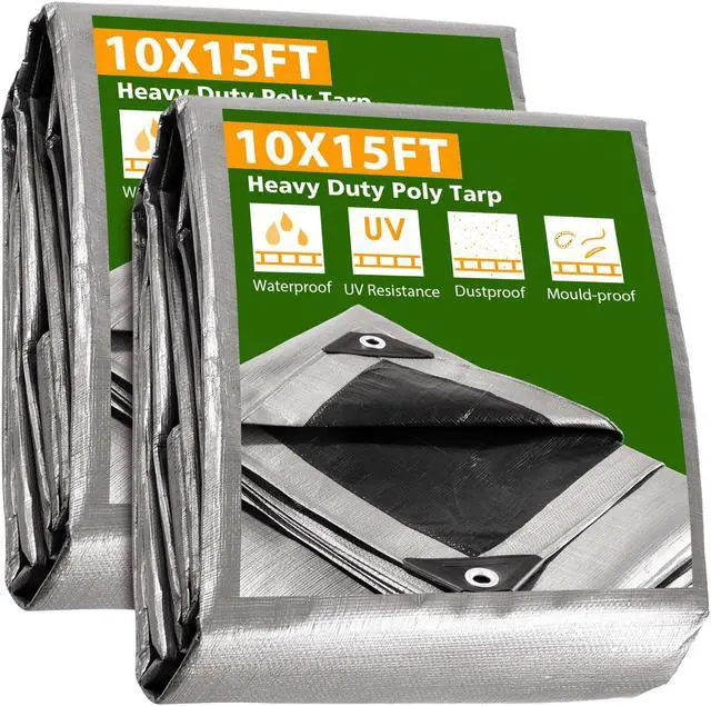 - Strong & Durable Shelter - 2 pack 10 x 15 ft silver and black poly tarps form a strong and durable shelter from sunlight, rain and dust, cooler underneath in the summer; with at least 3 years lifetime, it features good ability of anti-aging for long-time use