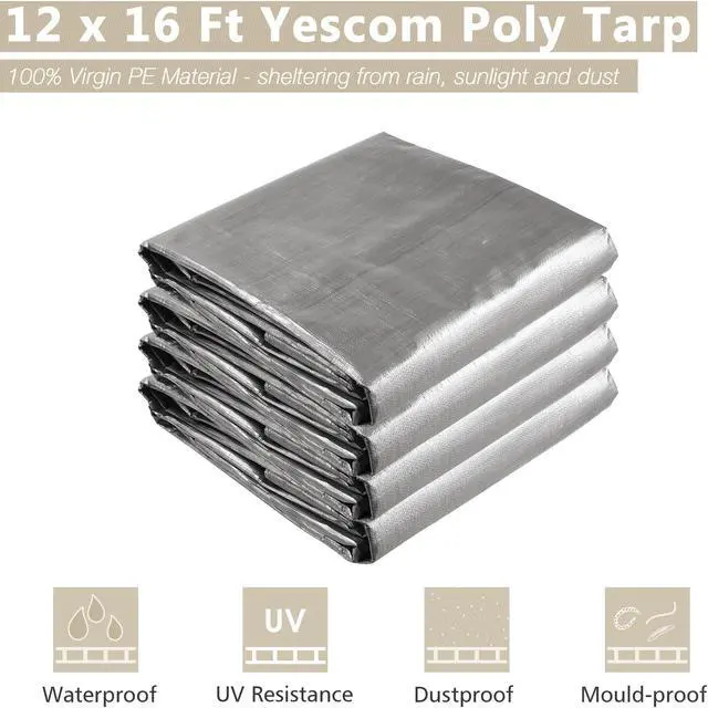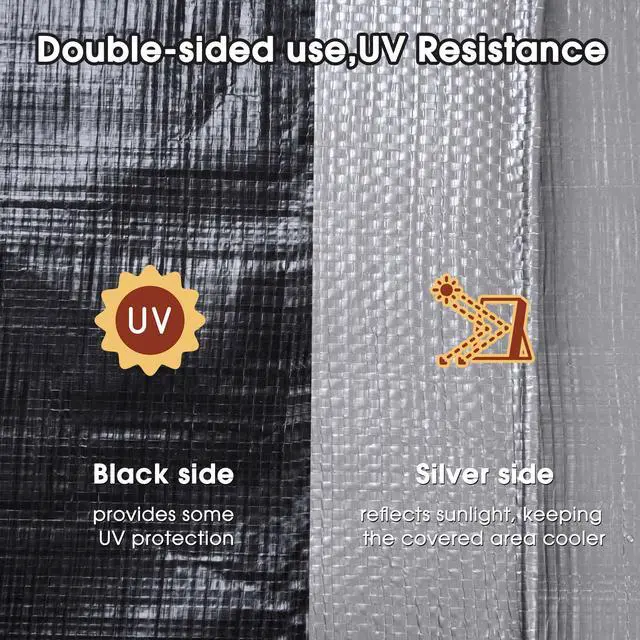 - Strong & Durable Shelter - 12 x 16 ft silver and black poly tarp forms a strong and durable shelter from sunlight, rain and dust, cooler underneath in the summer; Long lifetime up to 3 years, it features good ability of anti-aging for long-time use