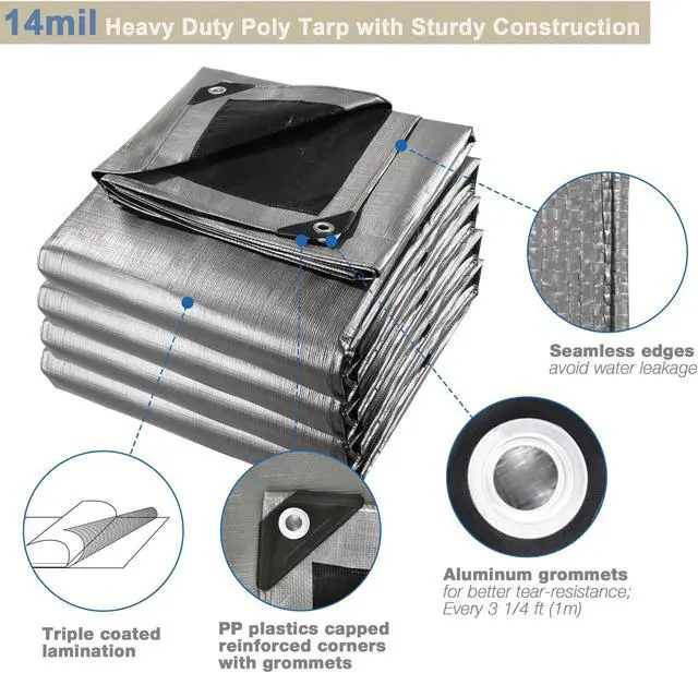 - Sturdy Poly Tarp - 14mil extra heavy-duty thickness and aluminum grommets in 3 1/4 ft (1m) interval for better tear-resistance, weights 8.64Lbs; PP plastics capped reinforced corners with grommets for sturdy construction; All seamless edges avoid water leakage