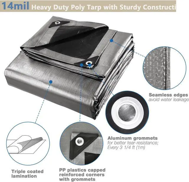 - Sturdy Poly Tarp - 14mil extra heavy-duty thickness and aluminum grommets in 3 1/4 ft (1m) interval for better tear-resistance, weights 27.03Lbs; PP plastics capped reinforced corners with grommets for sturdy construction; All seamless edges avoid water leakage