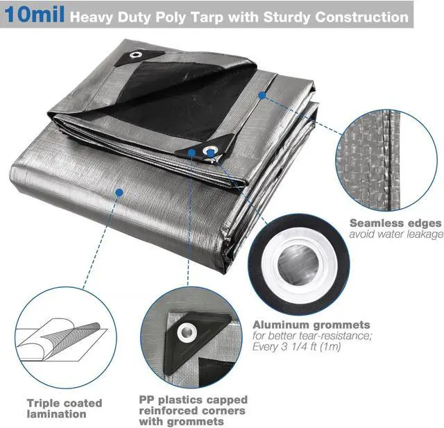 - Heavy Duty Sturdy Poly Tarp - Weights 6.48lbs, 10mil heavy-duty thickness and aluminum grommets in 3 1/4 ft (1m) interval for better tear-resistance; PP plastics capped reinforced corners with grommets for sturdy construction; All seamless edges avoid water leakage