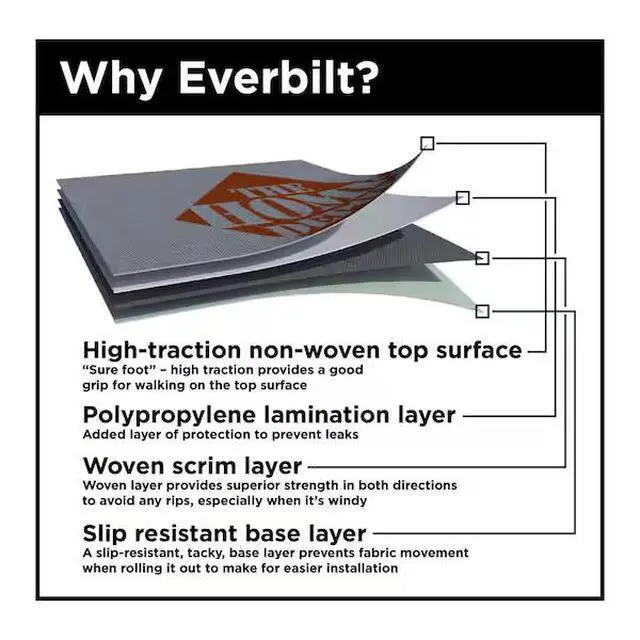 Everbilt Synthetic Roofing Underlayment provides a critical extra layer of protection between your shingles and your roof deck to help protect your home's structure and interior from the elements. Everbilt Underlayment features a unique 4-layer construction technology that is not only stronger and more durable than felt, but also super light weight. This, along with the tough high-traction surface for easy walkability and the advanced slip-resistant base layer provide for easy installations. Protect your home today with Everbilt Synthetic Roofing Underlayment.