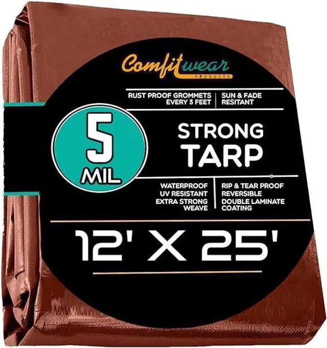 COMFITWEAR 5 Mil Brown Standard Tarp Cover Reinforced Grommet Multi-Purpose Pool Cover Boat Tarp Camping UV Resistant Poly Tarpaulin Waterproof Tarp Cover (12' X 25')