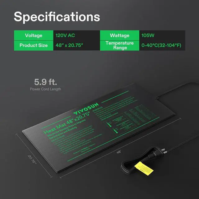 Multiple Uses:: This 48" x 20.75" heating pad with a 5.9ft power cord is suitable for 4pcs standard 1020 trays and slightly larger than comparable mats on the market; It also runs on only 105 Watts to help you save on electricity; It can not only use for plant sprouting and other indoor gardening but also for home brewing and terrarium warming, meeting your different daily needs