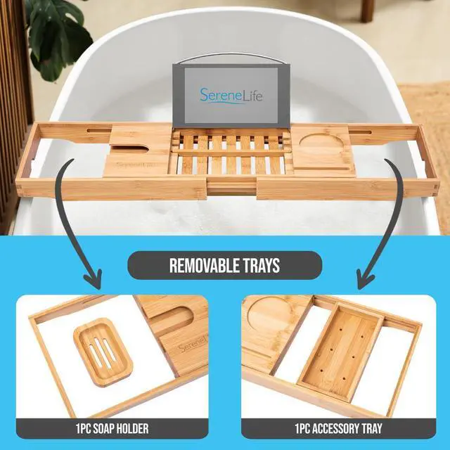 The SereneLife SLBCAD29N Natural Bamboo Bathtub Caddy Tray is designed to enhance your bath time experience with elegance and functionality. Made from 100% eco-friendly bamboo, this adjustable caddy tray is waterproof, mold-resistant, and built to last.