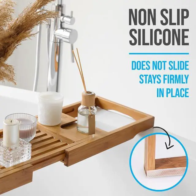 The expandable slide-out arms extend from 27.5 to 40.8, ensuring a perfect fit for most standard bathtubs. This bath tray includes dedicated slots for wine glasses, candles, books, and tablets, allowing you to relax in comfort.
