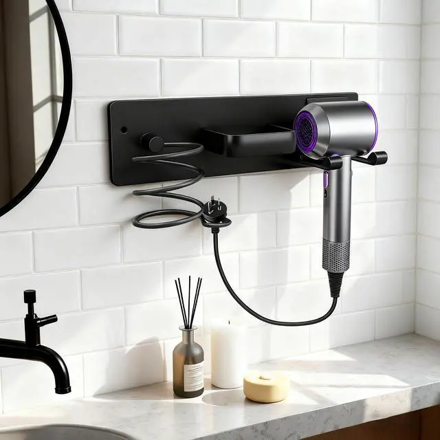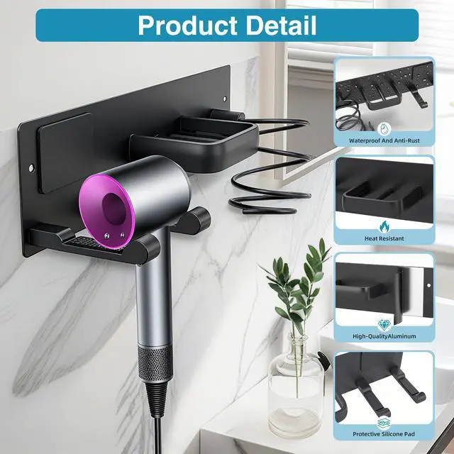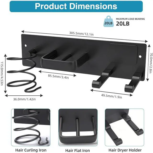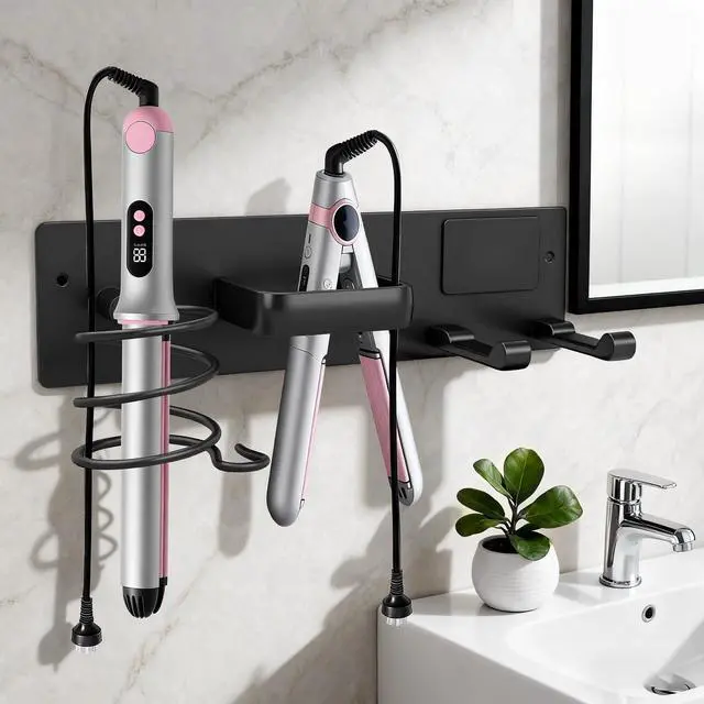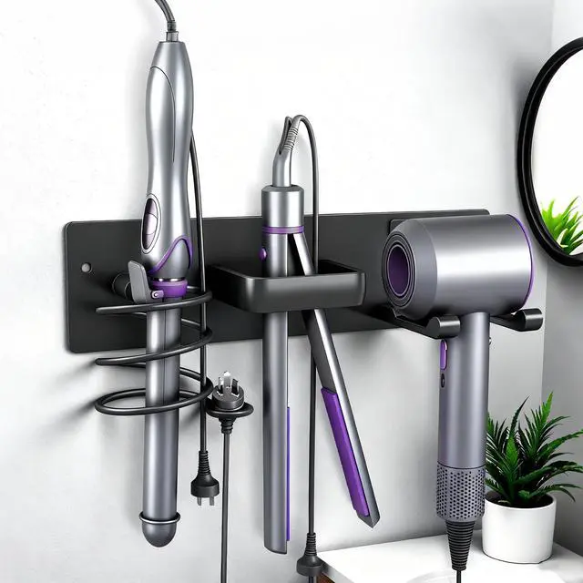 Dovyn 3-in-1 Hair Dryer Holder, Curling Iron Holder & Flat Iron Organizer Wall-Mounted Bathroom Hair Tool Rack in Matte Black Keep your bathroom countertops clutter-free with our 3-in-1 hair dryer holder, curling iron holder & flat iron organizer a wall-mounted hair tool rack (hair dryer holder wall mounted, curling iron holder wall mount) designed to securely store your blow dryer, curling wand, and flat iron in one neat spot. This bathroom hair tool organizer (hair tool holder, hot tools organizer) features a sturdy matte black finish and smart compartments to hold all your essential hair styling tools, making it the perfect hair dryer organizer, curling iron holder, and flat iron stand for any bathroom. The wall-mounted design (hair dryer holder, blow dryer holder) saves space, keeps your counters clean, and provides easy access to your tools whether you're styling at home or upgrading your bathroom organizer setup. Durable, sleek, and functional, this hair dryer holder stand is a must-have for organized hair tool storage.