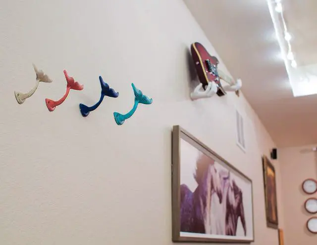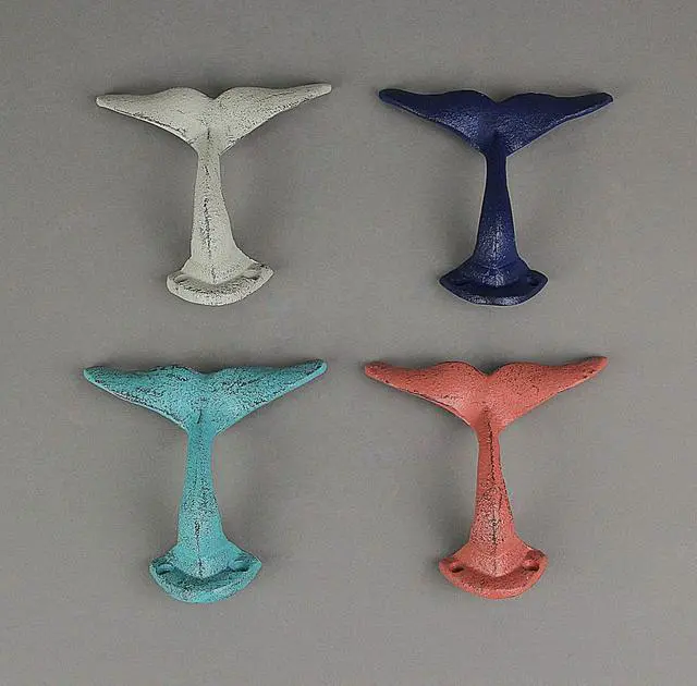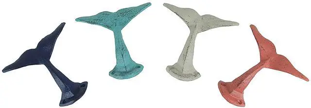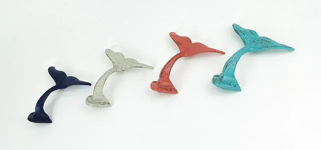 For a place to hang just about anything, these four whales playfully offer their cast iron tails and add instant coastal charm in any room. Arrange and display a variety of items whether in the bath, bedroom, or out near the pool. The whale tails are perfect for hanging towels, bags, pet leashes and so much more, and you can use them to create a decorative wall display and bring a whimsical touch to your decor. This 4 piece set of 3.25 inch high, 5 inch long, 3.5-inch wide cast iron whale tail wall hooks feature a distressed finish and two pre-drilled mounting holes let you easily attach them to any indoor or outdoor wall (screws not included).