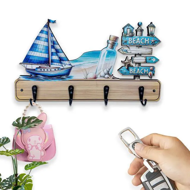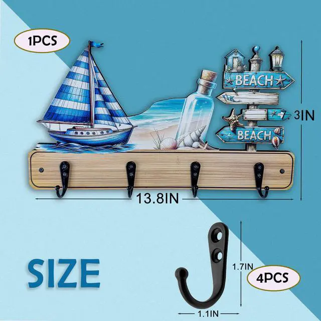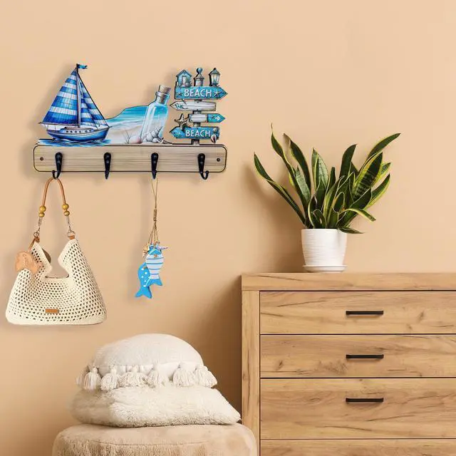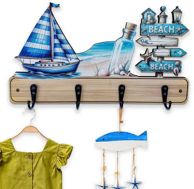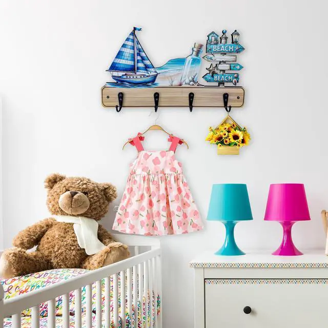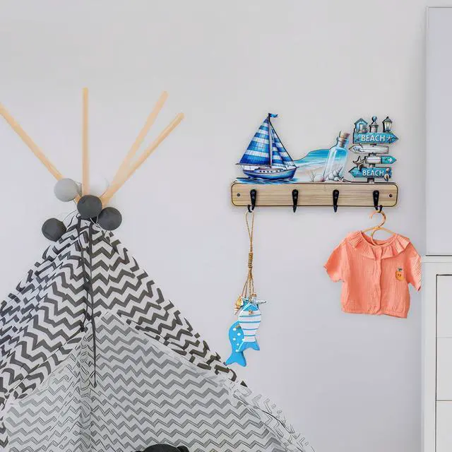 More than just decorative, this hook rack provides smart storage for your childs daily itemssuch as clothes, coats, towels, hats, or backpackshelping to keep their room clutter-free. The hooks feature delightful designs like fish shapes, nautical motifs, seaside cottages, beach themes, and ocean animals, making them both functional and fun. Add a lively touch of coastal charm while promoting a neat, modern, and playful environment in your childs room.