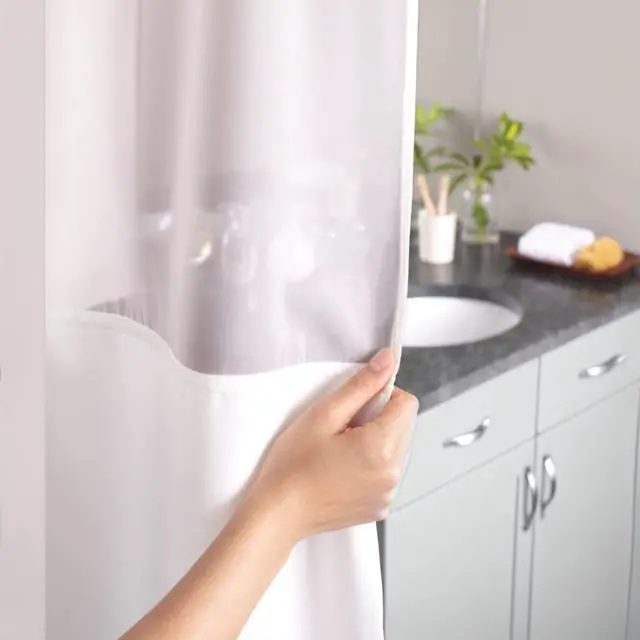The innovative Hookless Waffle Shower Curtain is designed to enhance your space effortlessly. The bathroom curtain set includes the fabric shower curtain, built-in rings, fabric liner with corner magnets, and a sheer window, providing a complete solution for your bathroom. This shower curtain set offers a 3-in-1 value, transforming your bathroom decor in seconds without the hassle of hooks. With no need to remove the rod, the shower curtain slides right on with its Flex-On built-in rings that won't rust. The Its A Snap! shower liner is made of polyester fabric and snaps on and off easily for quick replacements and water repellence. Our shower curtain features a sheer window for natural light, maintaining privacy while reducing humidity and moisture. Maintenance of these bath curtains is also a breeze; simply shake off excess water after each use and hang the curtain to air dry. For cleaning, machine wash the curtain on a gentle cycle and spot clean or replace the liner as needed. After each use shake off the water let the curtain hang freely outside the tub and allow it to air dry. Upgrade your bathroom effortlessly with the Waffle Hookless Shower Curtain. Its classic design, easy installation, and low-maintenance care make it a practical and stylish addition to any home.