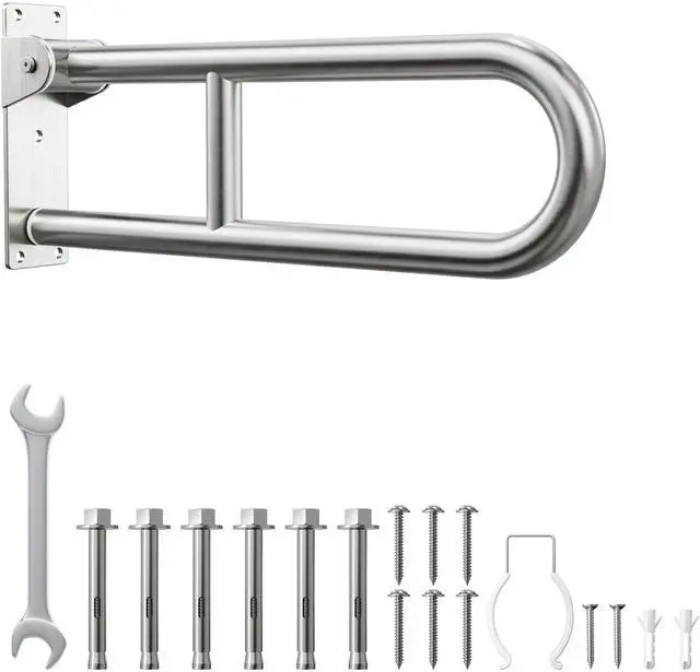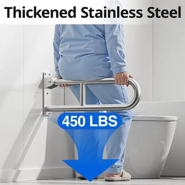 Enhance bathroom safety with this premium 304 stainless steel grab bar. Flip-up design saves space, while a secure wall clip ensures stability. Supports up to 450 lbs, ideal for seniors, pregnant users, and those with limited mobility. Complete mounting hardware simplifies installation on concrete or wood walls.