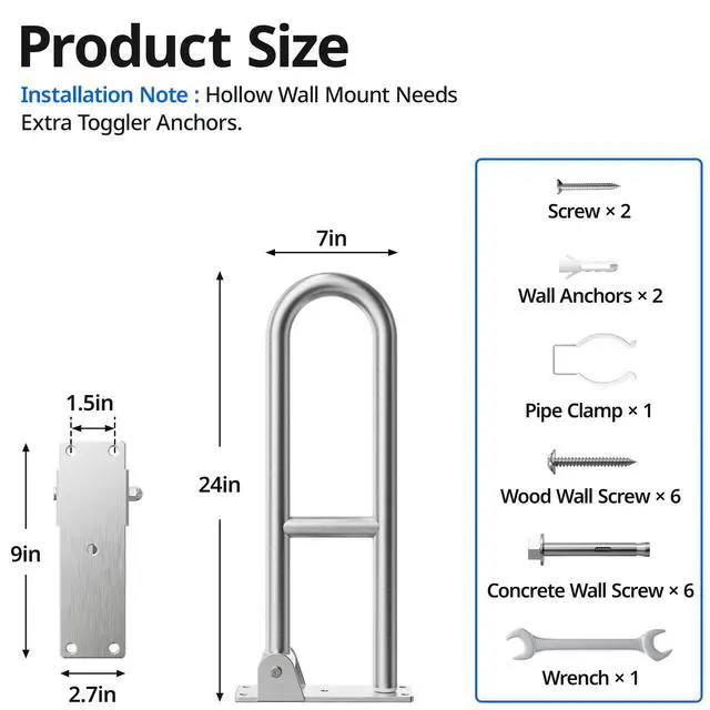 | Included Components | Toilet Grab Bar, 6 Stainless Steel Sleeve Anchors, 6 Stainless Steel Screws, 1 Wall Clip, 1 Positioning Template, 1 Allen Key |
