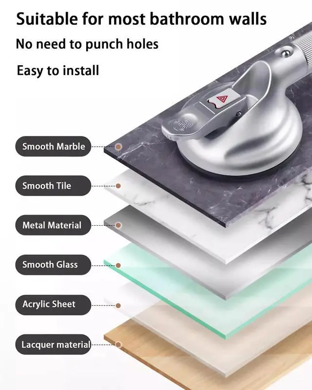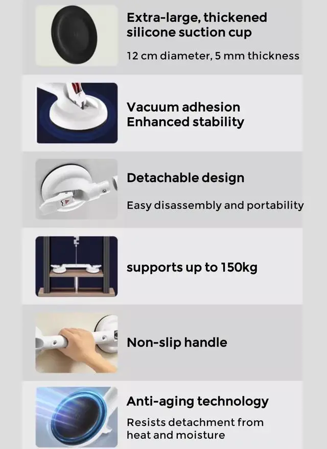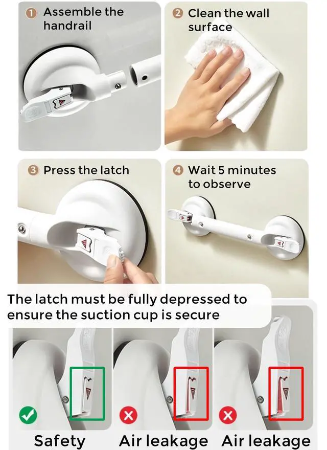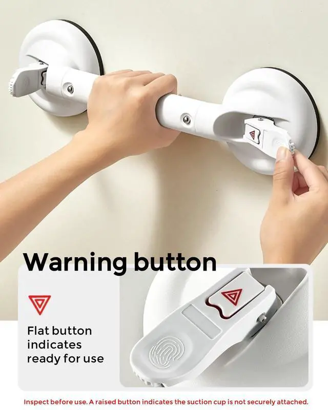 Large suction cup supports up to 130kg. However, over time or due to temperature/humidity fluctuations, air may enter the cup reducing suction. Always inspect handrail stability and suction cup seal before use.