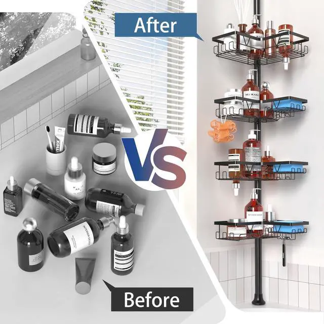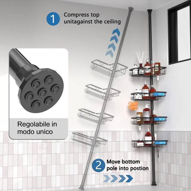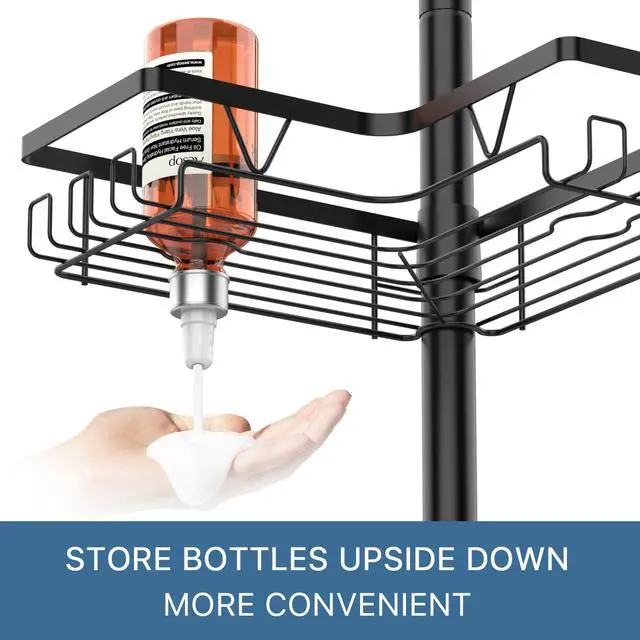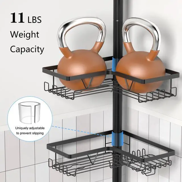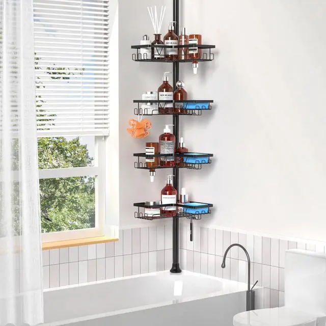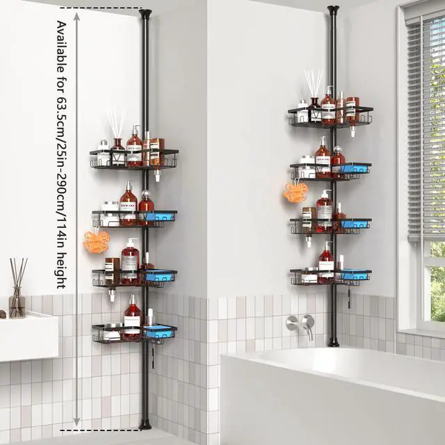 Transform your bathroom organization with this versatile tension pole shower caddy that extends from 25 to 114 inches in height. Featuring 4 spacious tiers of storage shelves in sleek black finish, this caddy maximizes vertical space while keeping your bath essentials within easy reach. Each shelf boasts an 11-pound weight capacity, providing ample support for bottles, soaps, and accessories. The thoughtfully designed shelves include drainage holes to prevent water accumulation, helping maintain a clean and dry storage space. The adjustable tension rod installs securely between floor and ceiling without drilling, making it perfect for rentals or permanent homes alike. The durable construction ensures stability while the modern aesthetic complements any bathroom decor. Whether mounted beside your bathtub or in a corner, this shower caddy offers an elegant solution to bathroom clutter, letting you organize everything from shampoo bottles to bath accessories in style.