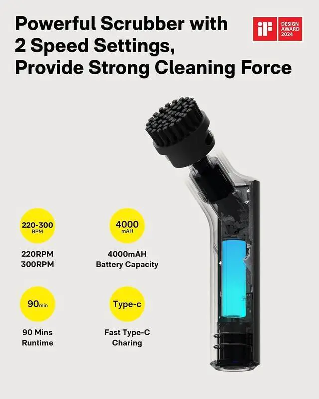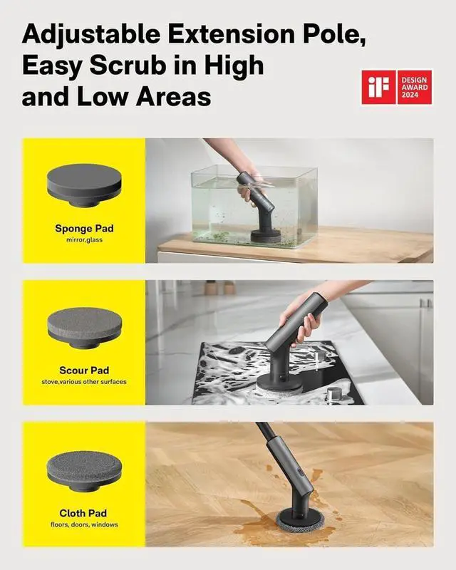 3 Versatile Brush HeadsScouring pad brush: suitable for surface cleaning of cooking benches and other surfaces. Sponge brush: suitable for cleaning mirror, glass and leather surfaces. Soft cloth brush: suitable for cleaning floors, doors and windows, etc. It can fulfill your various cleaning needs