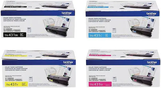 Set includes Genuine Brother toner cartridges TN431BK black, TN431C cyan, TN431M magenta and TN431Y yellow. Black cartridge yields 3000 pages; colors yield 1800 pages. Works with Brother hl-l8260cdw, hl-l8360cdw, mfc-l8610cdw, mfc-l8900cdw printers. All Brother genuine supplies are designed as part of a complete Intelligent printing system to provide superior quality and reliability. Brother genuine toner is precisely balanced for even flow and consistent toner distribution. Use only Brother genuine toner cartridges for reliable results and enjoy ongoing improvements and technical changes, which regularly occur throughout the hardware lifecycle.
