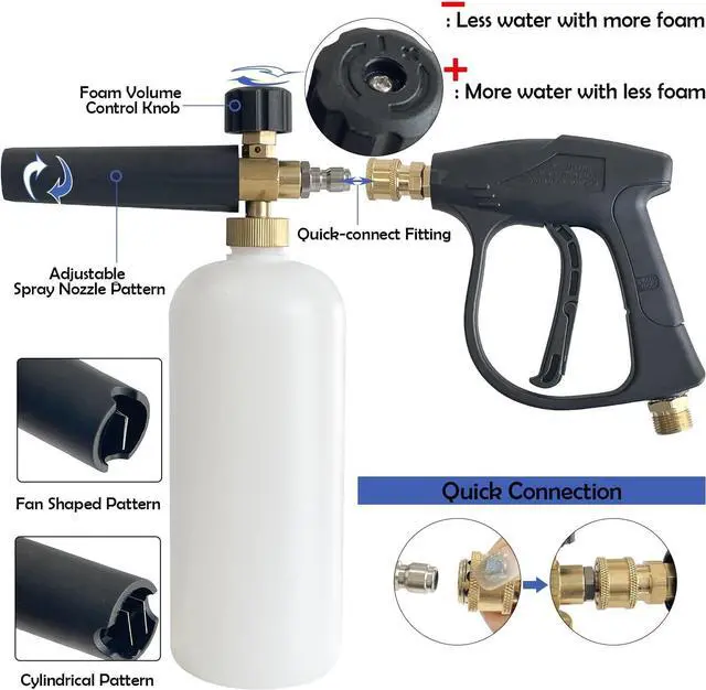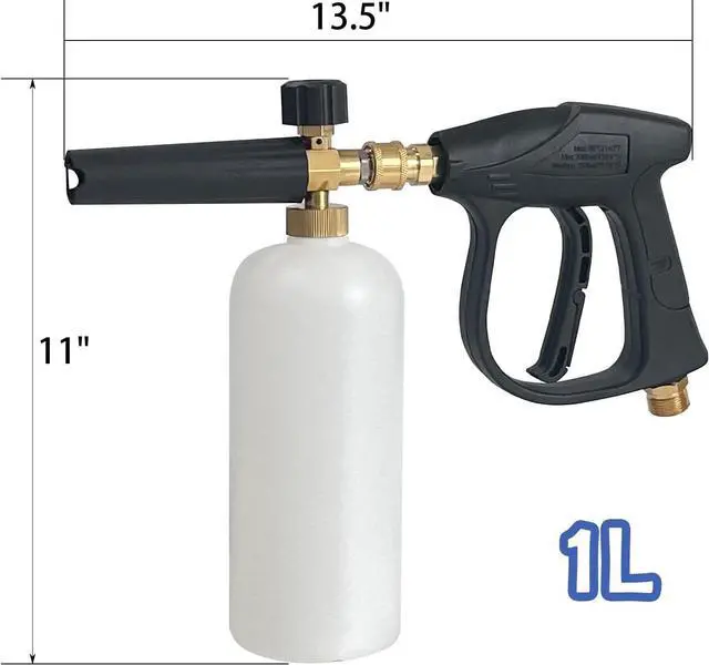 M22-14mm fitting foam gun with adjustable snow foam lance with 1/4" quick connection fitting. Capacity: 1 Liter, Maximum Pressure: 4000PSI.