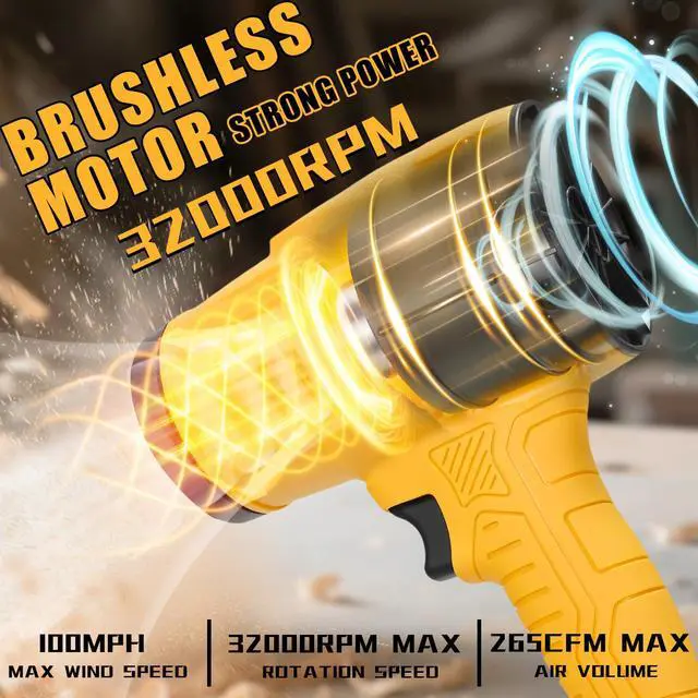 POWERFUL 45M/S WIND & BRUSHLESS MOTOR: Driven by a high-efficiency brushless motor reaching 32,000 RPM, this handheld blower generates a massive wind speed of 45m/s (100MPH), air volume of 265 CFM and 1200g strong wind pressure. It effortlessly tackles wet leaves, grass clippings, light snow, driveway debris, and workshop dust