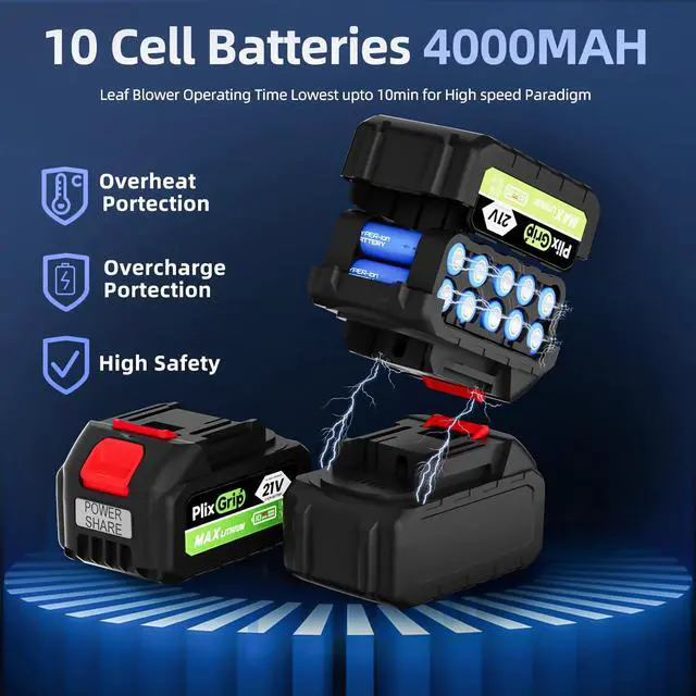 Cordless Leaf Blower 21V high-capacity batteries: The cordless leaf blower is equipped with two 21V 3000mAh lithium batteries, doubling the battery life,outdoor work without power outage anxiety small leaf blower. Support intelligent temperature control protection battery leaf blower, low battery/overheating automatic power off, safe and durable.