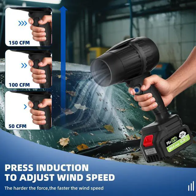 Electric Leaf Blower Cordless Intelligent Protection: Pressing stepless speed switch battery leaf blower with battery and charger,wind power is freely adjustable with pressing force (0-150 MPH),electric blower accurately responding to different scenarios; after the trigger of high temperature/over-discharge protection mechanism, turbo jet blower it will quickly recover in 20 seconds, making the operation more worry-free.