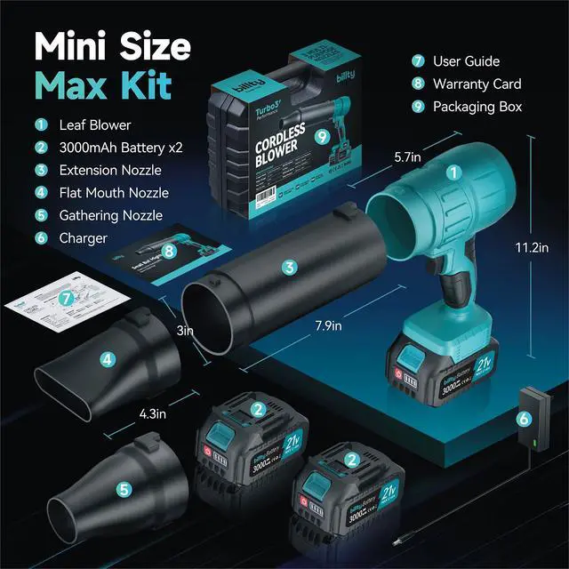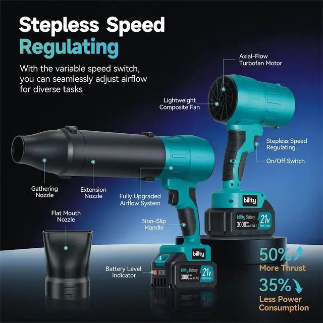 Unparalleled Home Cleaning Solutions: Tired of bulky, back-pain-inducing ordinary leaf blower or underpowered handheld blower? Billtys cordless leaf blower delivers the best of both worlds. Weighing only 2.5 lbs (including battery) with 3 versatile nozzles and stepless speed regulating control, its the effortless solution for home cleaning. Go seamlessly from outdoors to indoors to tackle leaves, dust, and debrisall with one tool