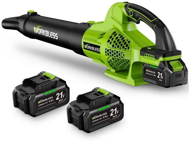 22000 RPM Powerful MotorConquer stubborn debris with 165 MPH max wind speed! WORKBLESS cordless leaf blower features a 22,000 RPM motor and dual-sided air intake, blasting 590 CFM for effortless clearing of leaves, dust, rocks, and even snow. Power meets versatility.