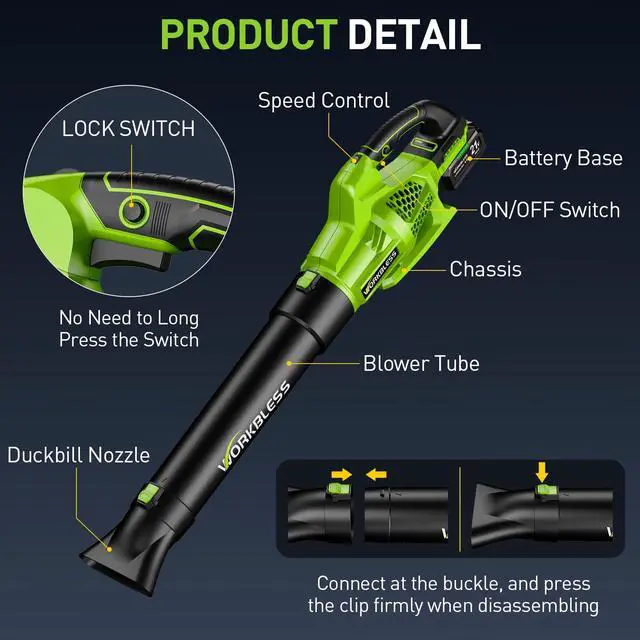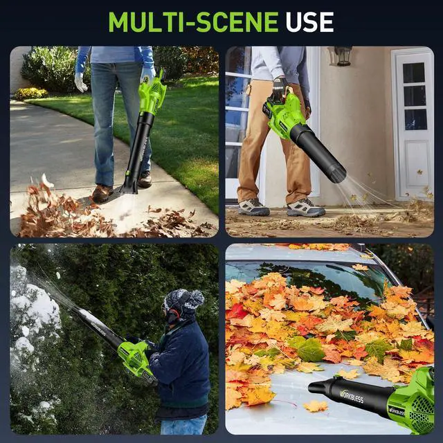 Professional-Grade & Multi-Scene UseWORKLESS PRO performance, no maintenance required! Say goodbye to gas blow dryer exhaust fumes and wired restrictions. This lightweight and durable electric blade blow dryer performs well both indoors (garages, workshops) and outdoors (lawns, patios). Easy to install, powerful results.