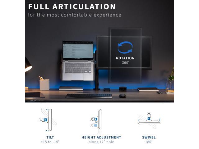 - Full Articulation: Adjustable arm offers +15° to -15° tilt, 180° swivel, 360° rotation, and height adjustment along the center pole. The monitor can be placed in portrait or landscape orientation