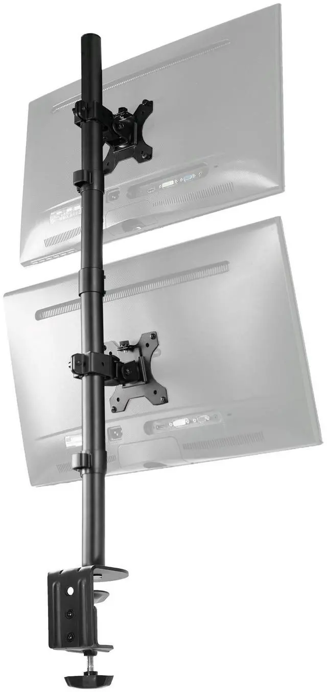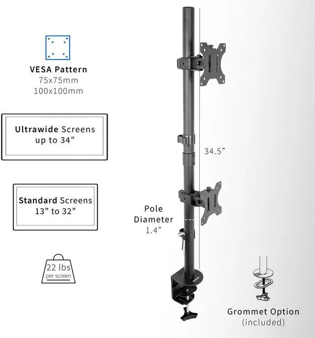 Clear up desk space by consolidating 2 ultrawide monitors on a single stand in a vertically stacked array with the Dual Monitor Extra Tall Desk Mount (STAND-V002T) from VIVO! Features include smooth articulation for comfortable viewing angles, integrated cable management for neatly routed cords, and height adjustment along the center pole for customized screen placement. Made of high-grade steel and aluminum, this stand fits most regular and ultrawide monitors 13" to 34" in size and up to 22 lbs in weight. Every joint is able to be tightened, so you can make your screen setup as fluid or stationary as desired.
