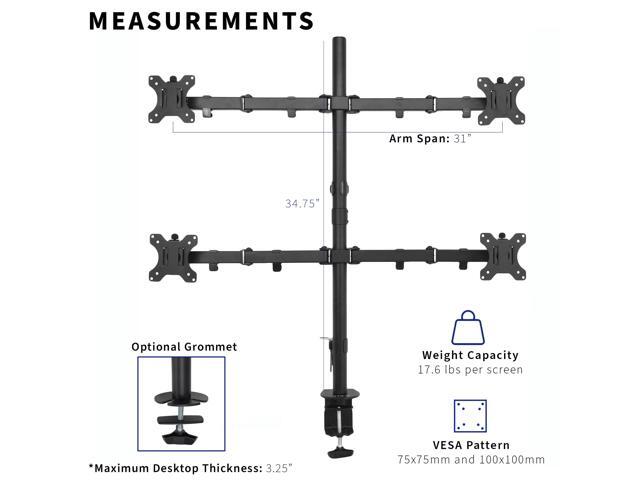 - Fits up to 30" Screens: This quad mount holds four screens up to 30" and 17.6 lbs each with 75x75mm and 100x100mm VESA mounting holes