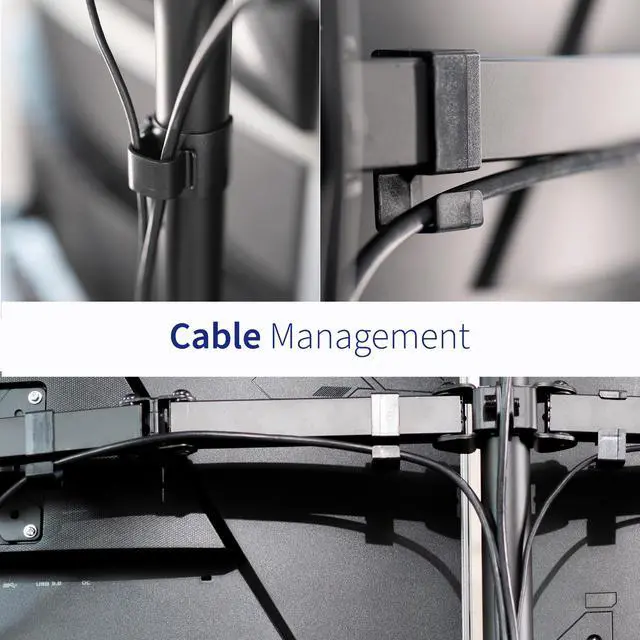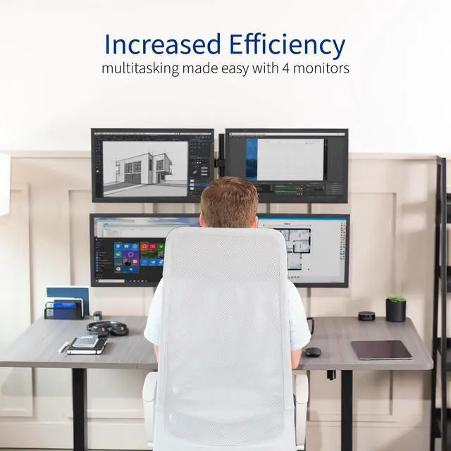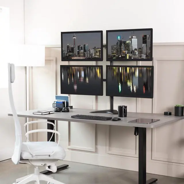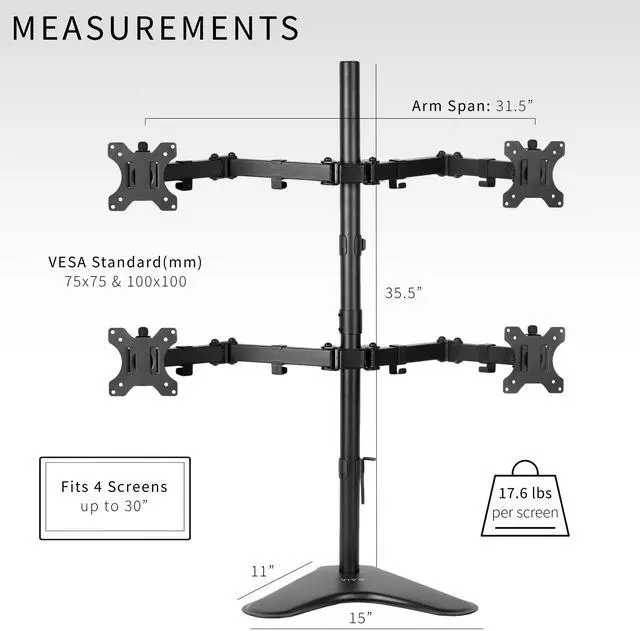 Quad monitor free-standing mount (model STAND-V004F) made of high-grade steel and aluminum from VIVO. Every joint is able to be tightened, so you can adjust exactly how fluid/stationary you want everything to be. Special features include the ability for each individual VESA plate to be adjusted up and down by 1" so your monitors will be perfectly aligned (see pictures and video for more information). We also made mounting your monitors easy with detachable VESA plates that screw into your monitor and then slide back onto the frame of the stand.