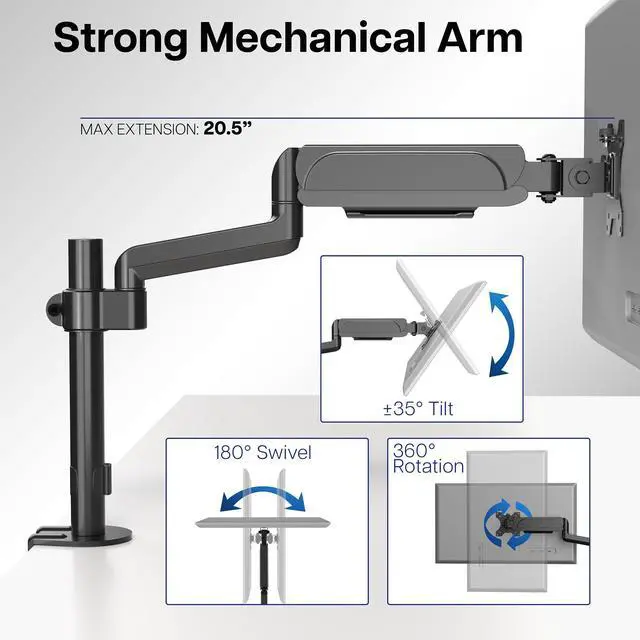 Optimize viewing angles with the Mechanical Spring Single Monitor Arm (STAND-V001K) from VIVO! Win back valuable desk space by elevating your monitor to an ideal viewing height with this high-grade steel stand built for scratch resistance and security. Designed with user-geared features such as screen articulation, smooth height adjustment, a sturdy C-clamp, integrated cable management, and more, this mount is customizable to your particular office needs. The versatility of screen placement allows ergonomic viewing that aids in decreased fatigue and muscle strain on the neck, back, and shoulders. The classy appearance adds a modern look to any office while providing ample support for your monitor. All hardware is provided for easy assembly, so you can get your stand mounted in no time!