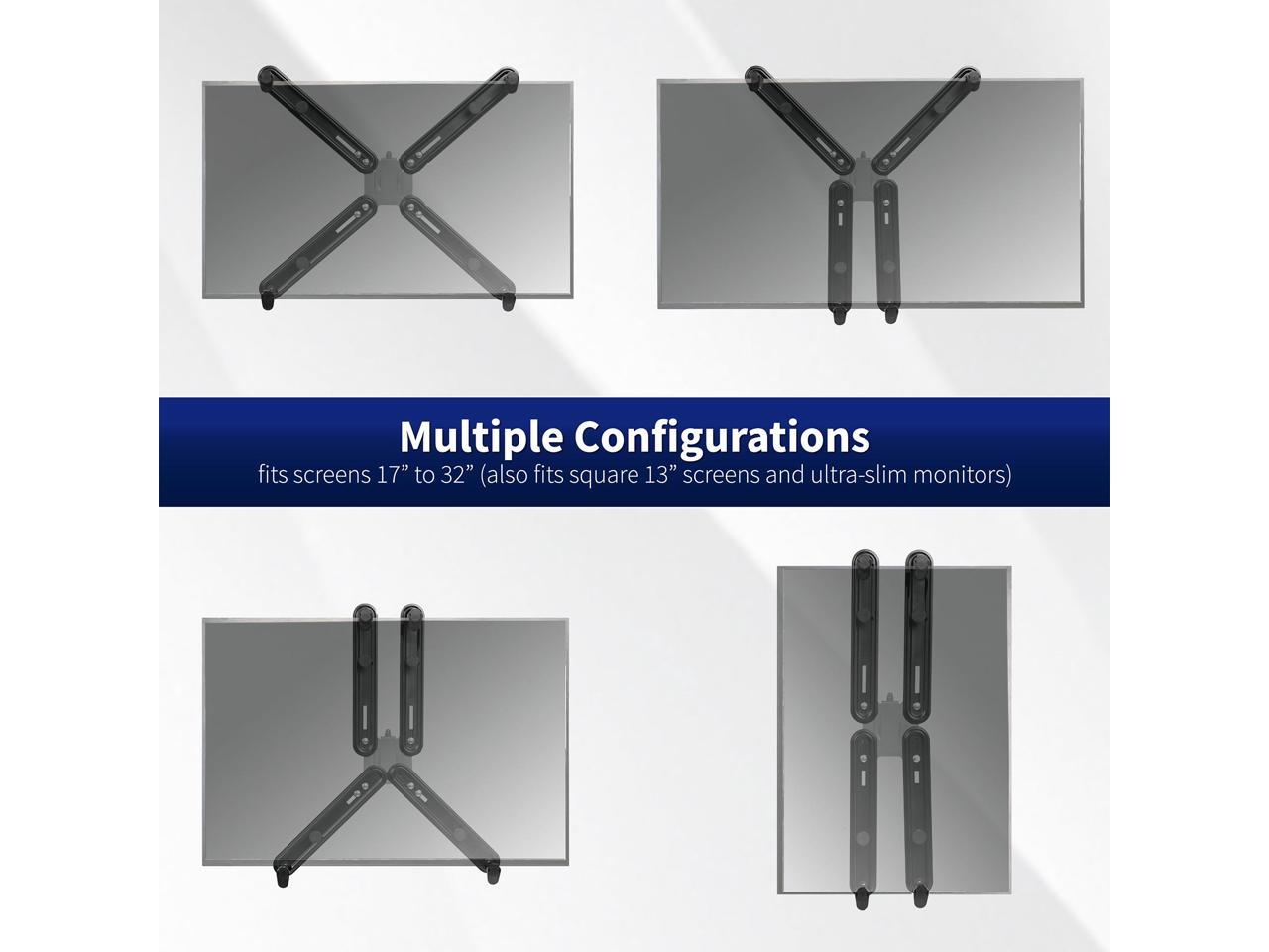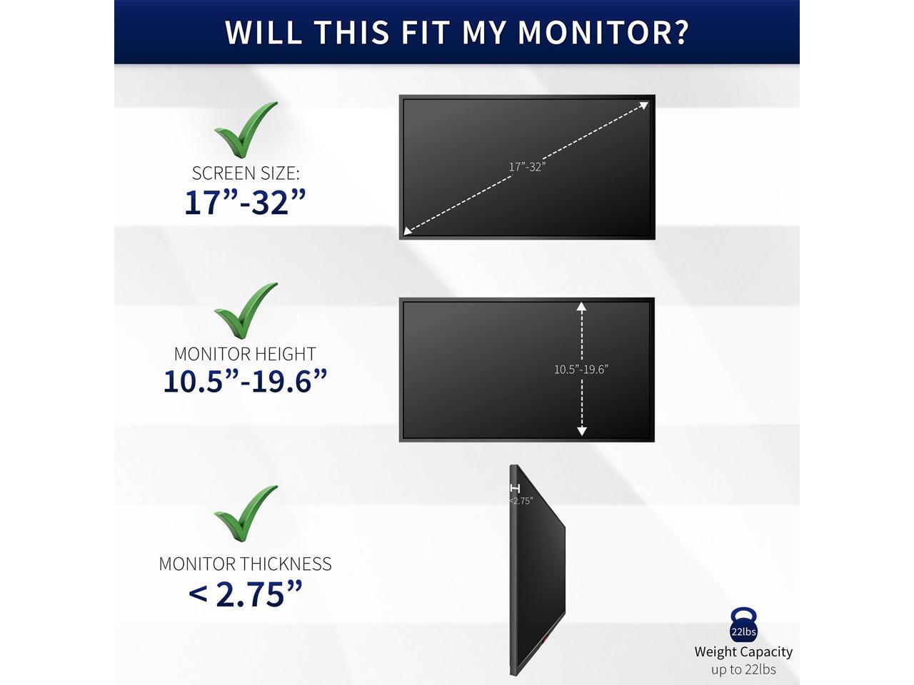 Fits 17" to 32" Screens: Adapter mounting kit its most flat screen LCD or LED monitors 17 to 32 (also fits square 13 screens and ultra-slim monitors) with a bezel height from 10.5" to 19.6" and a maximum thickness of 2.75"