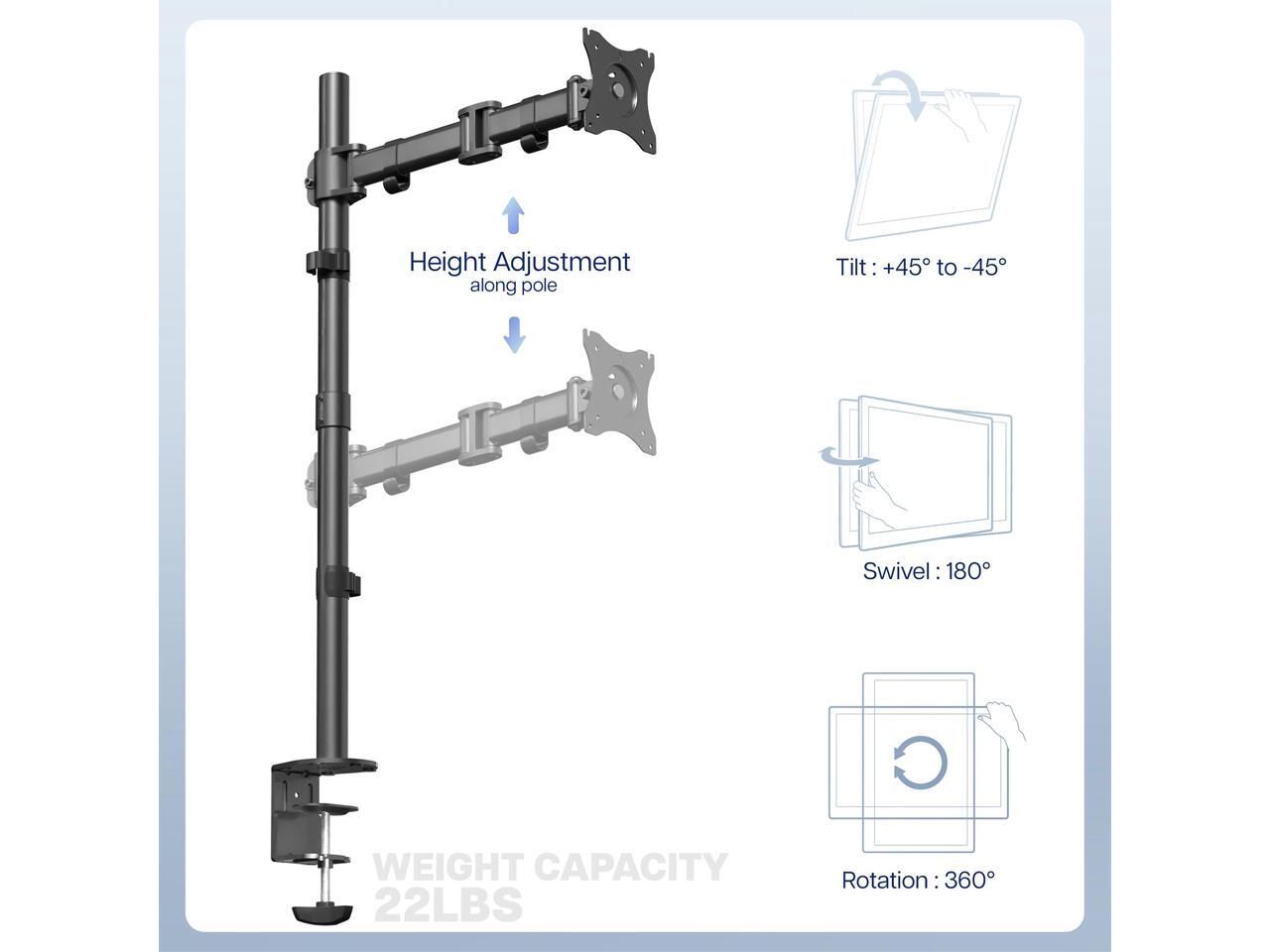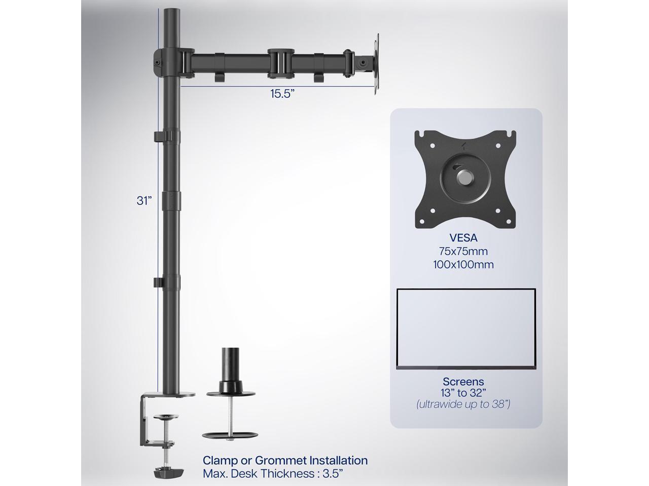 - Ultrawide Compatibility: Tall single monitor mount fitting most screens 13 to 32 in size and up to 22 lbs in weight with 75x75mm or 100x100mm backside mounting holes. Also fits ultrawide monitors up to 38" if under 22 lbs