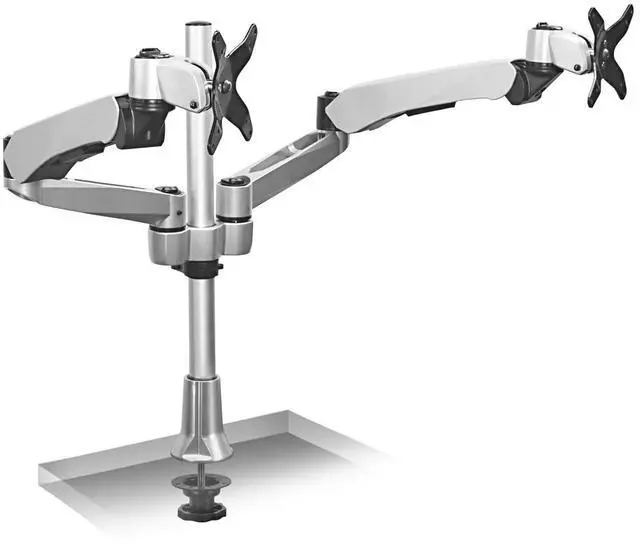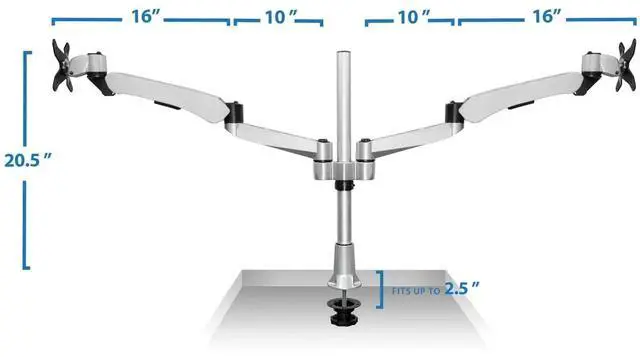 MI-45111 dual monitor mount features two gas spring arms for smooth full motion monitor adjustments. The extra long mounting pole measures 20.5, allowing for a large height adjustment range. From height adjustment, to monitor tilt, swivel and rotation, this monitor desk mount is designed to maximize the users efficiency and comfort. Boost productivity and enhance workflow with double the screen space, while improving posture and clearing up more desk space by elevating the monitors. This premium dual monitor mount is fully TAA (Trade Agreements Act) compliant and is suited for purchase by the U.S. government. It is a modular monitor mount, meaning it is fully customizable with the ability to add or remove monitor-mounting arms, which allows an organization to develop cost-effective, tailored solutions for their employees needs. The c-clamp base easily attaches to any desk measuring.79 to 2.36 thick, making it an easy addition to any workspace. It also includes a grommet base that securely attaches to a desktop hole opening. Each arm can carry monitors measuring in size up to 32 and up to 19.8lbs per mounting arm.
