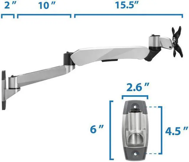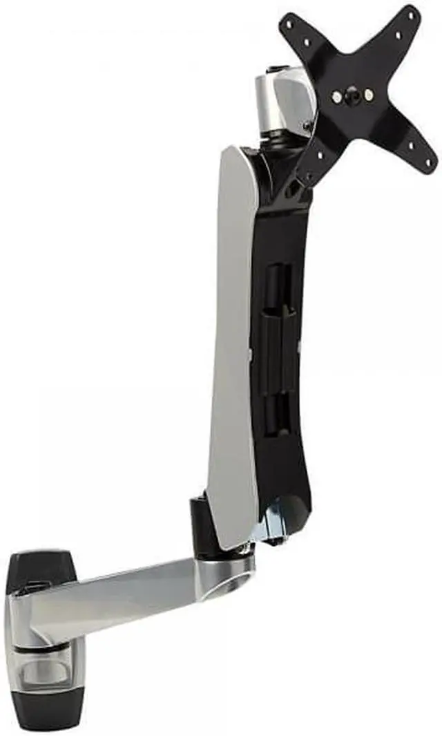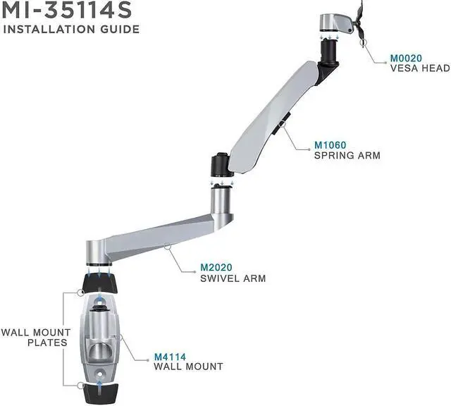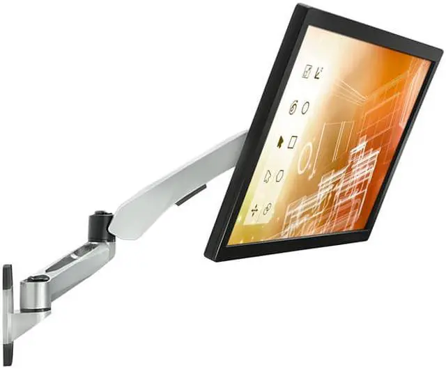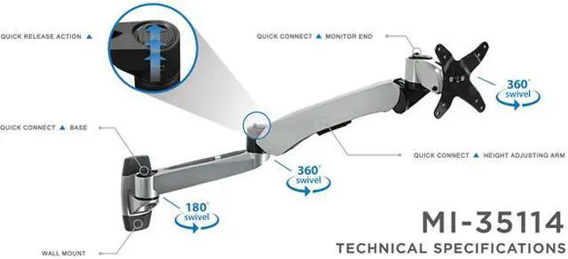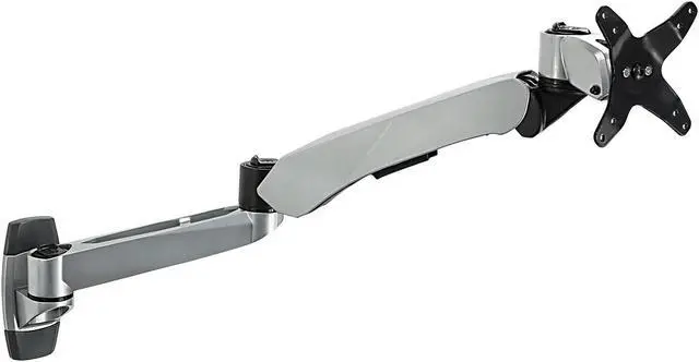 MI-35114 single monitor wall mount features an articulating gas spring arm for smooth full motion monitor adjustments. From height adjustment, to monitor tilt, swivel and rotation, this monitor wall mount is designed to save space while improving posture by raising the monitor to eye level in any type of environment. This premium monitor wall mount is fully TAA (Trade Agreements Act) compliant and is suited for purchase by the U.S. government. It is a modular monitor mount, meaning it is fully customizable with the ability to add, remove, shorten or lengthen the monitor-mounting arm, which allows an organization to develop cost-effective, tailored solutions for their employees needs. The easy to install wall mount requires only a single stud for installation making it a quick addition to any workspace. The arm features a cable management port to hide and organize cables for a clean look. Fits monitors measuring in size up to 32 and can hold up to 19.8lbs.