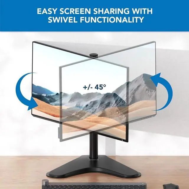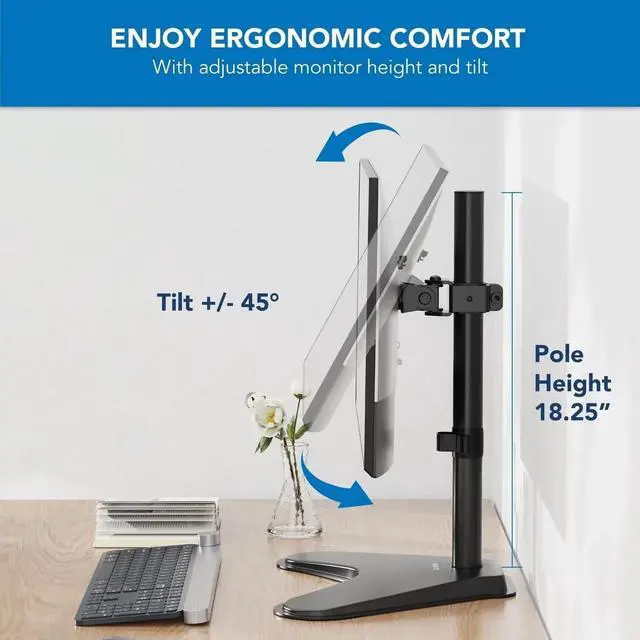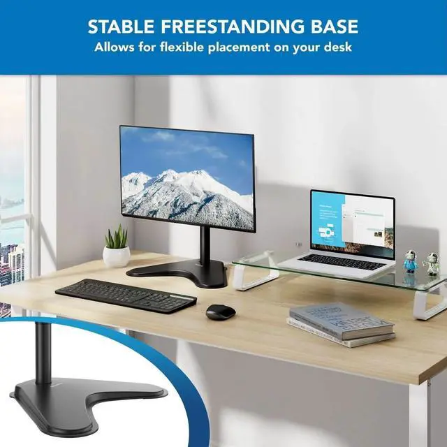 Desktop monitor mount features a quick-detach VESA plate that can be removed with a press of a button, cable management to keep your cords organized, non-skid freestanding base, and heavy duty steel construction that will stand the test of time.